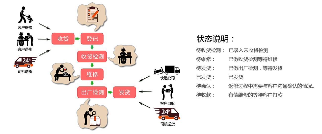 | 序号 | 返修条码 | 产品名称 | 维修状态 | 故障问题 | 发货日期 | 发货快递公司 | 发货快递单号 | 预计完成时间 |